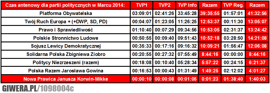 Czas antenowy dla partii politycznych w marcu 2014