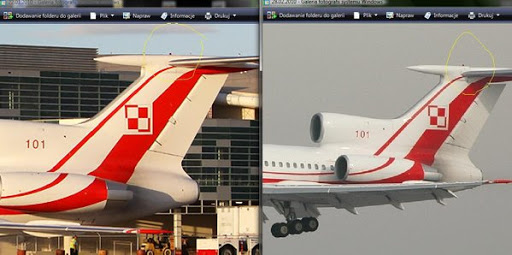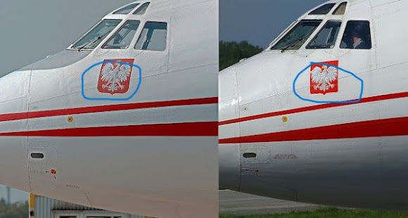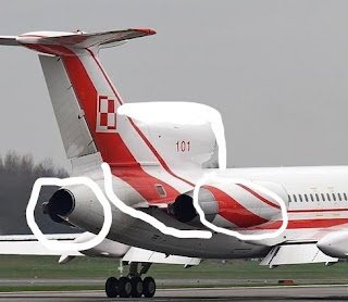 W ogonie Tupolewa dysza jest zupełnie inna ( obudowana ) ta jest zakończona blachą zewnętrzną. Pasek białoczerwony w Tupolewie leci od skrzydła do góry a nie w dół jak miejscu INSCENIZACJI.